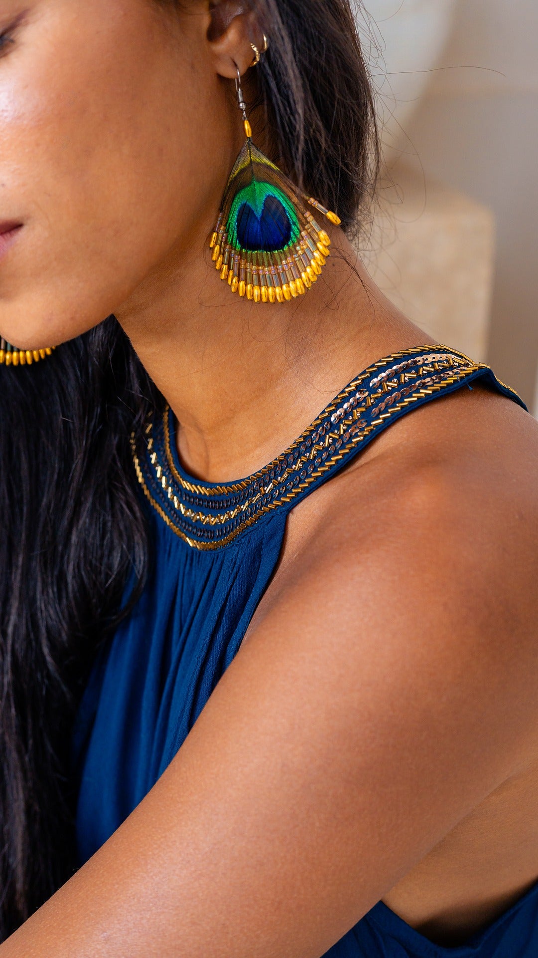 Les PAON BO capturent cette allure lumineuse et solaire qui traverse toute la collection JAVA. Réalisées à partir de plumes naturelles de paon, elles dévoilent des nuances profondes de vert, bleu et or, mises en valeur par un délicat travail de perles fines.