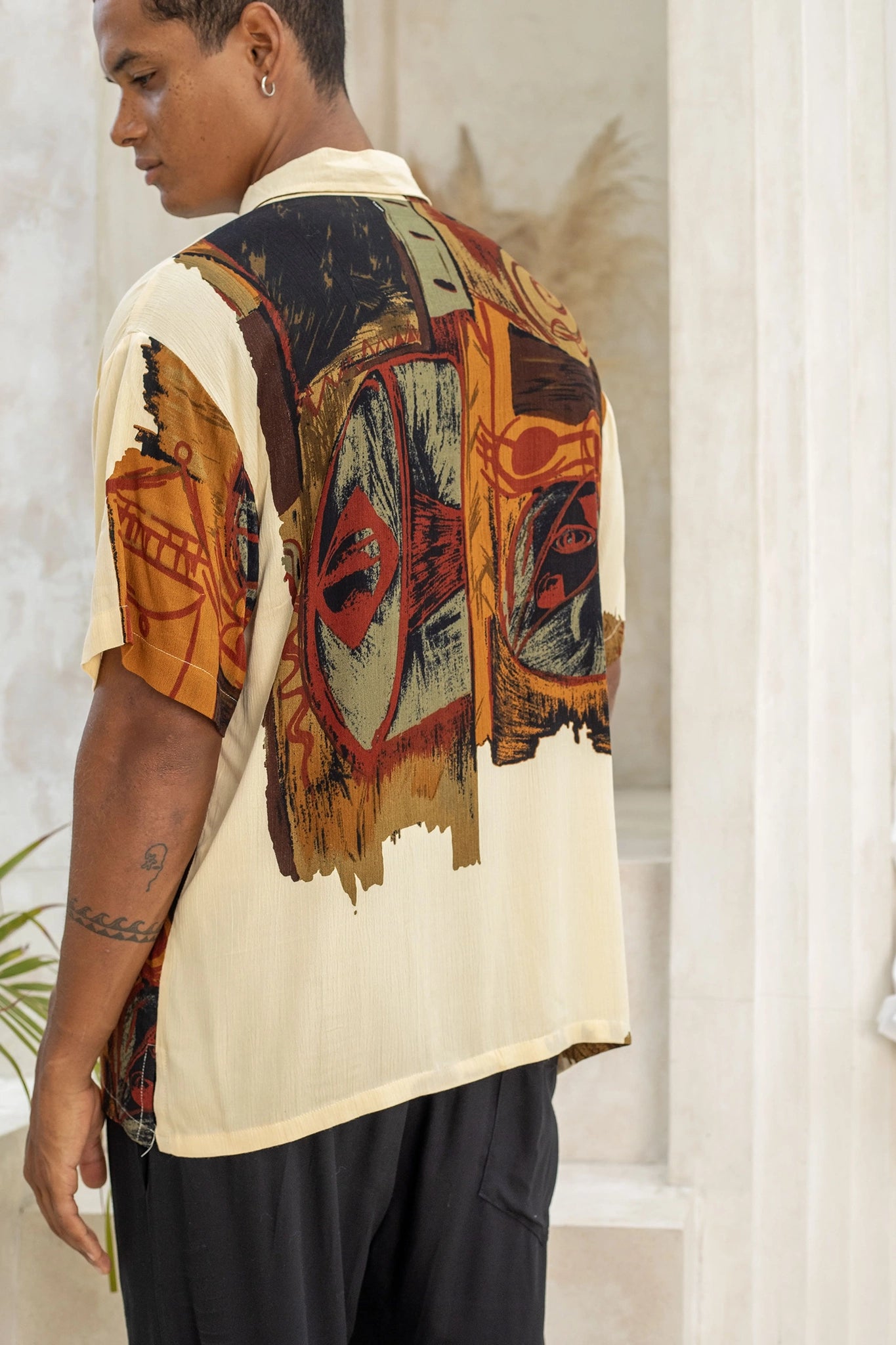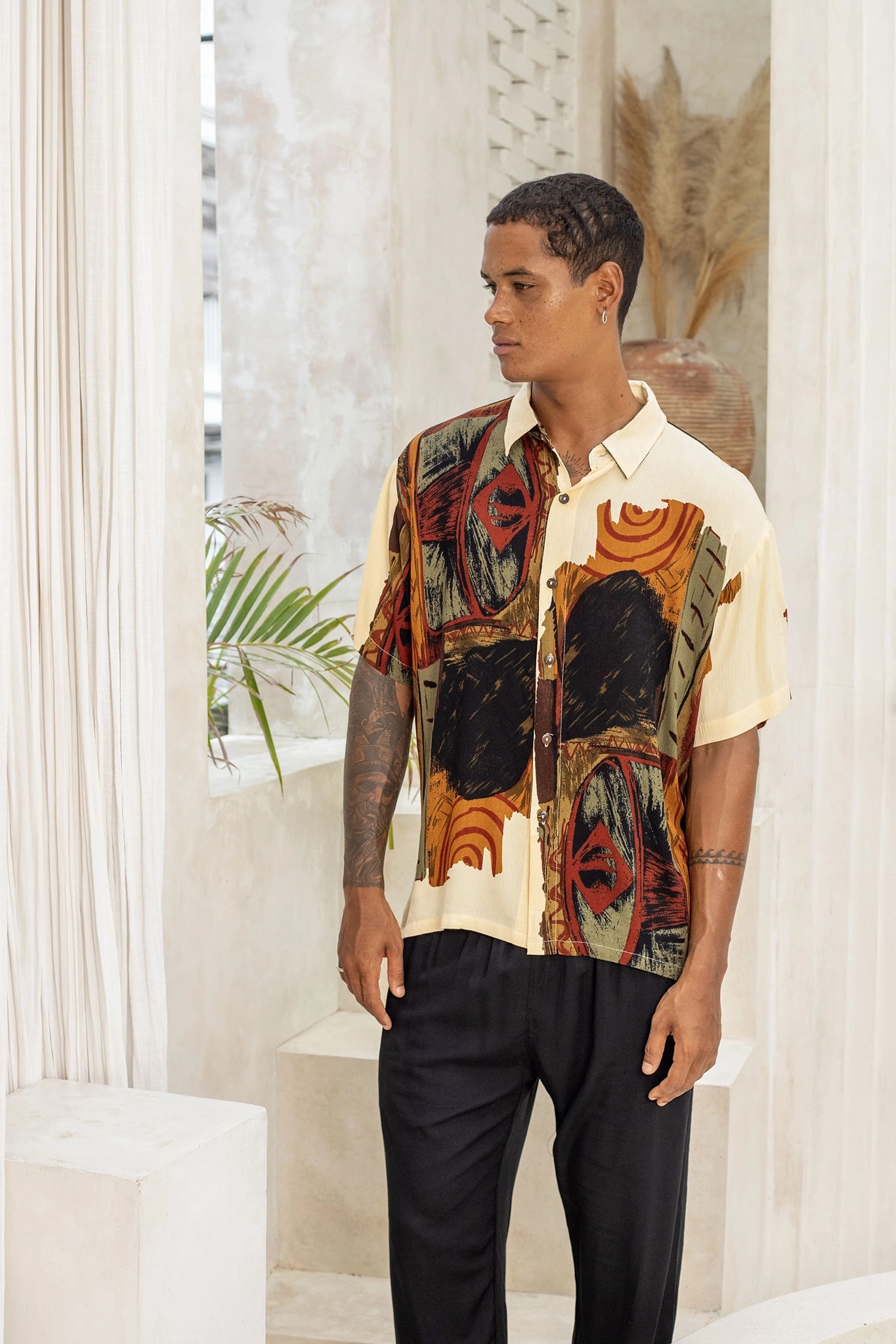 Le Top Kringkel incarne la rencontre entre l’élégance décontractée et l’individualité affirmée. Fabriqué à la main avec soin, ce haut à manches courtes et boutonnage frontal arbore un imprimé artisanal audacieux, offrant un style contemporain et unique.